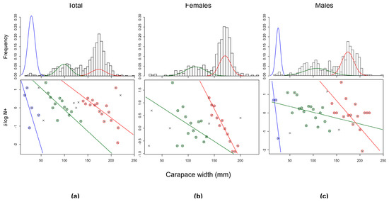 The occurrence of distinct cohorts in the size distribution of the blue crabs collected over the whole investigation was verified using the Bhattacharya’s method [68]. The procedure was implemented in the TropFishR R package [69,70] on CW data by fitting Gaussian components to mode means, and decomposing the size–frequency distribution into a series of normal curves representing the cohorts. Modes were accepted as distinct cohorts if their separation index was above a critical value of 2.0 [71].