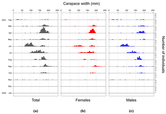 Figure 6. Monthly frequency distributions of the carapace widths of blue crabs captured during the investigation expressed in terms of sexes combined (a), females (b), and males (c).