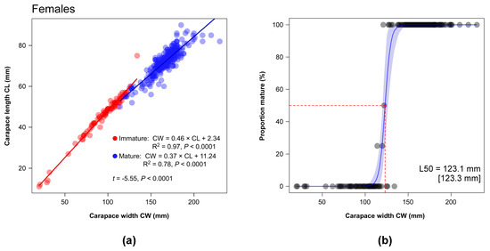 Figure 7. (a) Relationship between carapace widths and lengths (in mm) in female blue crabs; linear regression models are fitted to individual data subjected to a classification procedure (see text for details). The regression equation and the total explained variance (R2) are provided for each linear model; the results of an ANCOVA testing for statistically significant differences in the slopes of the two models are included. (b) The mean size at maturity (L50) of female blue crabs estimated using a bootstrapped binomial model applied to individuals classified as mature or immature through the analysis of carapace width–length relationships (L50CW-CL). Shaded areas represent 95% bootstrapped confidence intervals. L50 values estimated using a Bayesian procedure are reported in square brackets.