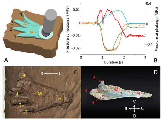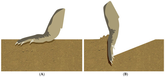 The locomotor steps started with heel planting, and then the foot was effectively “rolled” over the digits; accordingly, the substrate contact was always on the ventral surface of the foot. During walking, the digits exhibited little flexion; this was due to the composition of the 3D-printed and cast rubber feet and the phalangeal joints of the detached foot, which afford a greater range of ventroflexion compared to dorsoflexion. During pedal anchoring, the dorsal surface of the pes was typically dragged over the substrate (producing distinctive digital grooves [1]), and then the pes was rotated dorsally about the ankle and the leg extended to drive the dorsal surface of the pes against the substrate (so much that berms of the substrate formed on the dorsal surface of the pes [1]). This behavior was easy to replicate with the stiff 3D-printed foot and the slightly more flexible cast rubber foot. The flexibility of the digits of the detached foot meant that on the ventral palmar surface of the foot, there was a marked transition when the foot was rotated; the rotation through the substrate caused ventroflexion of the digits and a corresponding switch from tension to compression (Figure 6). This unique transition from tension to compression on the detached foot is the main reason that greater levels of difference were observed between the pedal anchoring trials compared to the walking trials (Table 2 and Table 3).