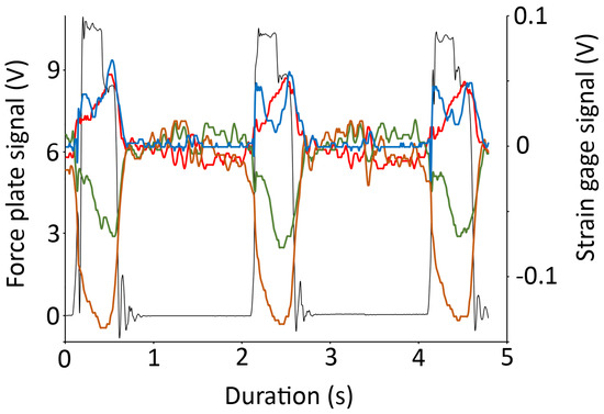 Raw data traces from a natural foot “walking” over the force plate. Simultaneously recorded voltage output from the force plate (black trace) and the four strain gauges (dorsal surface of the proximal 3rd phalange—blue; plantar surface of the proximal 3rd phalange—green; dorsal surface of the 2nd metatarsal—red; and plantar surface of the 2nd metatarsal—orange) demonstrate that even though the foot was “walked” manually, it resulted in fairly consistent signals. Note that the force plate operated over a different voltage scale (left y-axis) than the strain gauges (right y-axis).