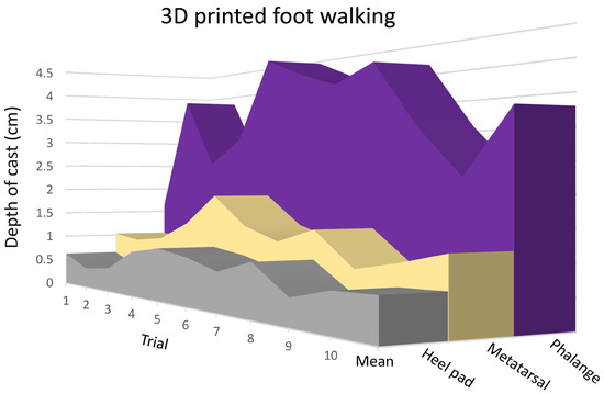Data from the 10 walking trials involving manually moving a 3D printed pes. Note that although these movements were made manually, there is consistency in the data both in the pattern (phalanges always have the deepest penetration, and the heel pad always has the shallowest) and across the trails (increases in heel pad depth are mirrored by increases in metatarsal and phalangeal depth). The mean of the ten trials is presented on the far right.