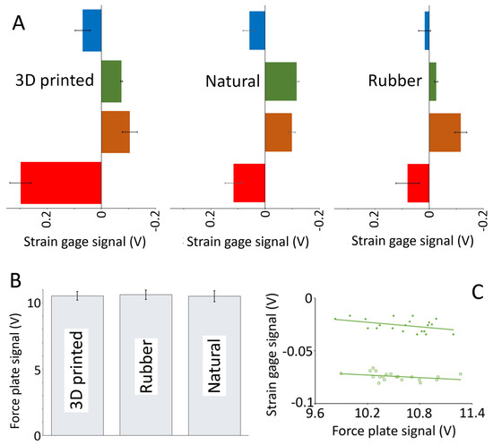 Relative variation in the strain gauge data. Each pes was instrumented with four strain gauges positioned on the dorsal surface of the proximal 3rd phalange (blue), the plantar surface of the proximal 3rd phalange (green), the dorsal surface of the 2nd metatarsal (red), and the plantar surface of the 2nd metatarsal (orange). (A) Each pes was then manually moved (in this case, in a walking motion over a force plate) for ten trials; the bar width is the mean, while the error bars display ±1 standard deviation. (B) The corresponding force plate signals; note the difference in the y-axis between the strain gauges and the force plate. There is relative consistency in the data, in both the forces applied to the force plate when manually moving the pes, and in the resulting pattern of four discrete strain gauge voltages (one from each recording site) on each pes. Some of the variation denoted by the error bars reflects the linear relationship that was found between each strain gauge signal and the force plate signal. (C) The relationship between these two for the plantar surface of the proximal 3rd phalange on the rubber pes (solid circles) and the 3D printed pes (open squares).