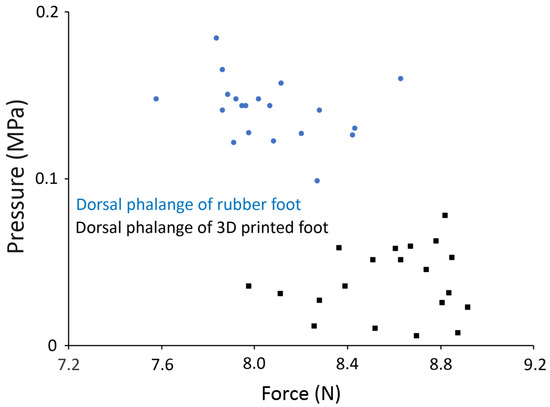 Relative consistency and differentiation of the pressure values. The pressure determined from the dorsal surface of the 3rd phalange during ten walking trials of the rubber pes (blue circles) and the 3D printed foot (black squares). These two model feet are the same size, and the strain gauges are positioned the same way, yet movement over the same force plate yields two discrete (and significantly different) pressure levels. Note that during the trials involving the 3D printed pes, slightly higher forces were applied (x-axis), yet the pressures recorded at the phalange were slightly lower (y-axis).