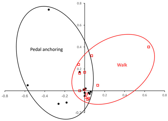Results of the principal component analysis (PCA) of the pressure values are shown; the first component (horizontal axis) and third component (vertical axis) account for approximately 66% of the variation. There is a population of walking pressures (red) and a population of pedal anchoring pressures (black) that overlap in a zone of minimal pressure differentiation.