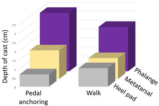 A principal component analysis (PCA) of the Z-transformed pressures for the three trial feet walking on mud and pedal anchoring in mud produced two overlapping groups of characters (Figure 9), explaining some 62% of the variation in pressure values. The Eigenvectors (component scores) for this analysis (see the Supplementary Materials) were used to identify 10 trials with maximal “Walk” PCA pressures and 10 trials with maximal “Pedal anchoring” PCA pressures. The casts from those 20 trials were then compared. A MANOVA found a significant (F = 122.65, p < 0.0001) difference between the walk and pedal anchoring casts, and Tukey’s post hoc analysis found significant differences between the depth of the heel pad, the metatarsal depth, and the depth of the phalanges (Figure 10).