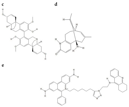 Structures of (a) resveratrol (CID: 445154), (b) cyanidin (CID: 128861), (c) bis-(-)-8-demethylmaritidine (CID: 169450457), (d) huperzine A (CID: 854026), and (e) TZ2PA6 (CID: 5289508) drawn using ChemSketch Freeware.