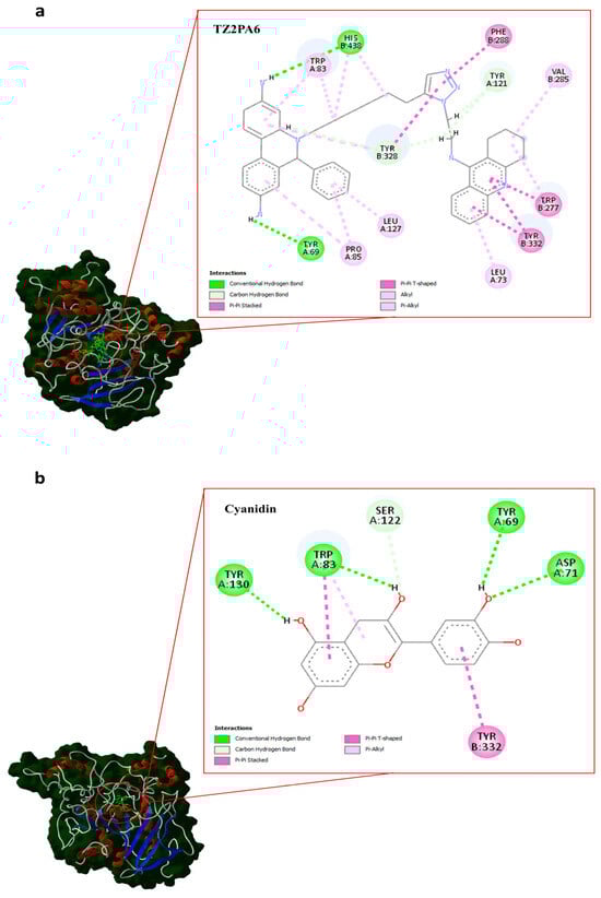 All docking results were thermodynamically favorable, regardless of the method used for binding energy prediction (DockThor and MM/PBSA), with an overall mean binding energy of ΔG ≈ −12 kcal.mol−1 (Table 1). According to the DockThor calculations, the thermodynamic mean was ΔG ≈ −9 kcal.mol−1, with a minimum of ΔG ≈ −8 kcal.mol−1 and a maximum of ΔG ≈ −12 kcal.mol−1. TZ2PA6 was the compound with the most favorable binding free energy (ΔG = −12.03 kcal.mol−1), followed by cyanidin (ΔG = −9.50 kcal.mol−1). For illustrative purposes, the most favorable complex in each case is shown (Figure 2). The remaining compounds exhibited similar binding energies (ΔG ≈ −8.9 kcal.mol−1) according to the DockThor algorithm. Both TZ2PA6 and cyanidin established various interactions with AChE including hydrophobic interactions and several conventional hydrogen bonds as well as carbon hydrogen bonds. Cyanidin exhibited twice as many conventional hydrogen bonds with AChE compared to the control (TZ2PA6), which, in turn, presented double the carbon hydrogen bonds with AChE compared to those exhibited by cyanidin. It is important to note that most interactions of TZ2PA6 and cyanidin occurred with aromatic residues adjacent to the active site reported for AChE, notably highlighting the shared interaction with residues Tyr69 and Trp83 as well as with the aromatic residue Tyr332, which is also present in the active site of the highly related enzyme butyrylcholinesterase (BuChE) [79,80]. These aromatic residues are crucial for the stability of the complexes formed with different ligands [81]. These results are significant because most of the binding affinities predicted by DockThor have been described to be moderate in the range of high to low micromolar affinity units (scores < −8 kcal.mol−1 are associated with submicromolar affinities) [79]. In addition, the relative binding energies obtained for the compounds in this study corresponded to those reported by other authors for the same protein in the context of a wide variety of synthetic compounds and utilizing related docking tools [82,83,84].