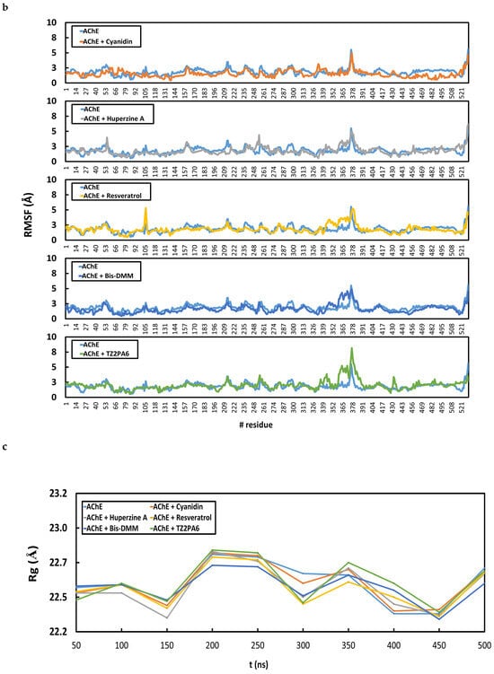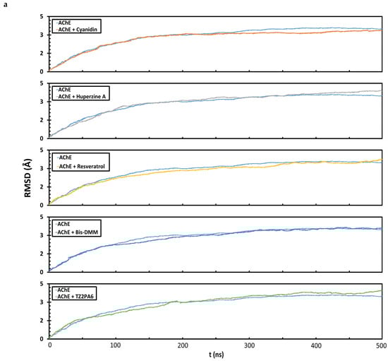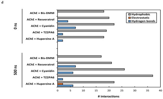 The complexes formed by DockThor were used in the MD simulations to evaluate the stability of the compounds bound to AChE and select low-energy conformations to study the deformability as well as the conformational and energy-structural changes of AChE in the presence of each ligand [39,68]. From the minimum energy structures generated by MD, data were obtained for (1) MM/PBSA (Table 1), (2) RMSD (Figure 3a), (3) RMSF (Figure 3b), (4) Rg (Figure 3c), and (5) interaction depletion (Figure 3d), as suggested [39,85,86]. The means of the dynamic parameters calculated after 500 ns of MD indicated the stable binding of all compounds considered in this study to AChE, regardless of the nature of the compounds (RMSD ≤ 2.8 Å, RMSF ≤ 1.7 Å, and Rg ≤ 22.55 Å) (Figure 3). Cyanidin was the compound that exhibited a slightly more stable binding oriented toward structural folding (RMSD = 2.7 Å and RMSF = 1.50 Å) compared to the free protein (RMSD = 2.9 Å and RMSF = 1.83 Å) and the other compounds (Figure 3) in terms of both the RMSD and RMSF. In all cases, an increase in the type and number of interactions was predicted after MD, with the largest number of predicted interactions being hydrophobic, except for the interactions between AChE and Bis-DMM, which showed little variability. Figure 3 displays a representative run of each trajectory at 500 ns of MD for each of the studied complexes.