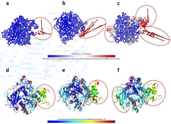 The top panel shows a graphical representation of the collective mobility of the nodes, indicated by a ribbon ranging from blue (low mobility) to red (high mobility), highlighting in a red circle parts of the complex (a) AChE (b) with TZ2PA6 and (c) with cyanidin after 500 ns of MD. The lower panel shows the same complexes, but this time it is represented by a ribbon ranging from blue (residues with a propensity to broadcast the response to a perturbation) to red (residues with a propensity to receive such perturbation) for the complexes (d) AChE, (e) with TZ2PA6, and (f) with cyanidin over the same period of time.