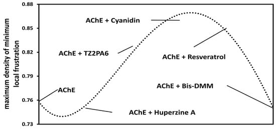 Graphical representation of the maximum values of minimally frustrated residues of the AChE protein system free and in the presence of each compound.