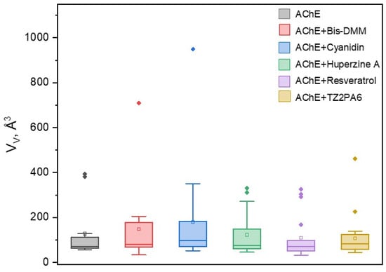 In this context, all compounds altered the number and distribution of AChE’s internal cavities, with an average volume of approximately 130 Å3. This represents a difference of approximately 5 Å3 compared to the average volume of AChE’s intrinsic internal cavities after 500 ns of MD, with an average minimum of approximately 30 Å3 and a maximum of approximately 950 Å3. Cyanidin was the compound that produced the greatest variability in the distribution of internal cavity volume (Figure 6), generating the largest cavities compared to the other compounds and even exceeding up to three times the volume of the largest internal cavity predicted for AChE (Table 4).
