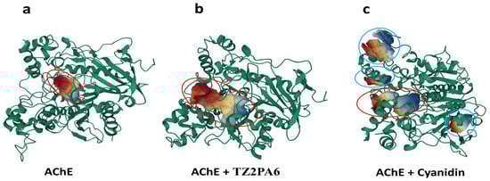 Tridimensional representation of internal cavities near the binding site. Only internal cavities with druggability probability = 1.0 are shown. In the red circle, an internal cavity near the binding pocket and the blue circles show other internal cavities in different regions with also a druggability probability = 1.0. (a) AChE (b) with TZ2PA6 and (c) with cyanidin after 500 ns of MD.