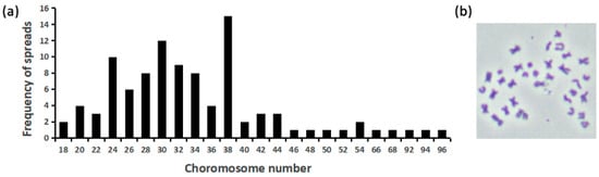 A total of 100 metaphase ES cells (passage 50) were analyzed; their chromosome number ranged from 18 to 96 (Figure 2a). The modal diploid karyotype of 2n = 38 was presented in only 15% of all samples, suggesting that the ES cell line was aneuploid (Figure 2b) [39].