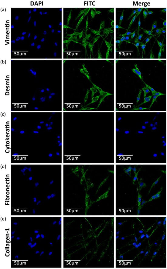 Immunofluorescence staining of 5 markers in passage 55 ES cells: (a) vimentin; (b) desmin; (c) cytokeratin; (d) fibronectin; and (e) collagen-1. The cell nuclei are indicated with DAPI (blue), and the cell markers are indicated with FITC (green).