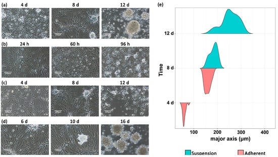 In the batch culture process with an inoculum density of 5 × 105 cells·mL−1, a confluent monolayer was formed by day 2; spheroidal cell clusters were first observed to be adherent and then automatically turned into suspension over time with volume increases. In the meantime, co-localized attraction and disintegration of the adherent cell layer occurred along with the presence of suspending cell clusters (Figure 4a). The suspension ratio and volume change in the cell clusters at different stages were measured and analyzed (Figure 4e). On day 4, all cell clusters were attached to the surface of the cell layer, with their major axis ranging from 48.42 to 81.09 μm; on day 8, the adherent and suspension clusters shared a major axis ranging from 127.22 to 221.75 μm; and by day 12, all clusters observed were in suspension with a major axis in the range of 135.38–355.04 μm, while the adherent cells were still observed to be in a dispersed pattern (Figure 4a,e).