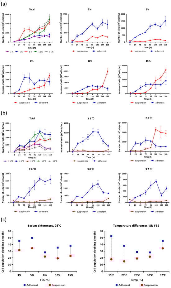 The growth characteristics of passage 55 ES cells under different serum percentages and temperatures. (a) Growth curves at 26 °C with different FBS%; (b) growth curves at different temperatures with 8% FBS (inoculum density = 106 cells·mL−1); and (c) the population doubling time (PDT) of adherent and suspension cells. The growth curve values are exhibited as the mean ± standard deviation (SD), n = 3.