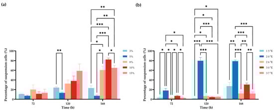 In the serum difference tests, at 72 h after inoculation, the suspension ratio (%) of the cells showed no significant difference among the five groups; at 120 h post-inoculation, the only significant difference was observed between the 3% and 5% groups; and at 168 h after inoculation, the suspension ratios of the 3% and 5% groups were significantly lower than those of the 8%, 10%, and 15% groups, while the suspension ratio of the 10% group was significantly higher than that of the 15% group (Figure 6a). In the temperature difference tests, the suspension ratio (%) of the 20 °C group was significantly higher than those of the other four groups at all time points. In addition, at 72 h after inoculation, the suspension ratio (%) of the 30 °C group was significantly higher than that of the 37 °C group; at 120 h post-inoculation, the suspension ratio (%) of the 15 °C group was significantly lower than those of the 26 °C, 30 °C, and 37 °C groups; and at 168 h after inoculation, the suspension ratio of the 30 °C group was significantly higher than those of the 26 °C and 37 °C groups (Figure 6b).