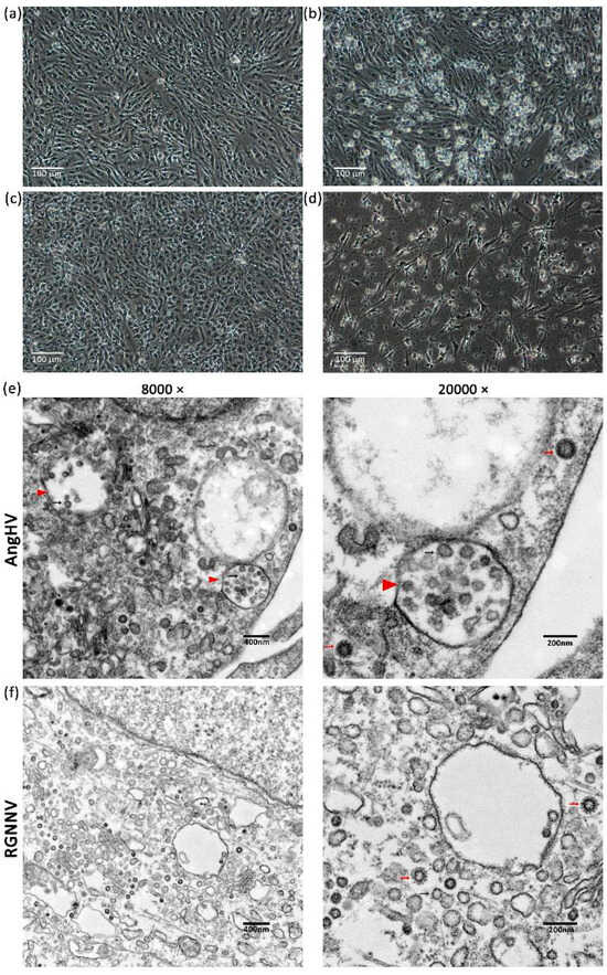 Both the AngHV and RGNNV samples were able to cause CPEs on the ES cells continuously across the three subcultures. Compared with the confluent control groups (Figure 8a,c), the AngHV-infected cells were observed to have become rounded and detached from the monolayer at 60 hpi (hours post-infection) (Figure 8b), while the RGNNV-infected cells were observed to have shrunk and collapsed massively, accompanied by an increase in mortality. At 72 hpi, the mortality rate of the RGNNV-infected group was evaluated to be over 85% (Figure 8d).