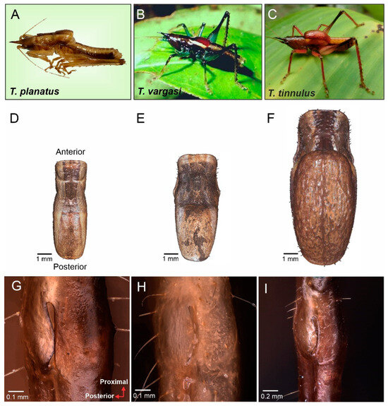 Morphological characters of Tectucantus spp. (A–C) Habitus of male of T. planatus, T. vargasi, and T. tinnulus. (D–F) Dorsal view and size comparison of pronotum. (G–I) Tectucantus spp. tympanal slits design.