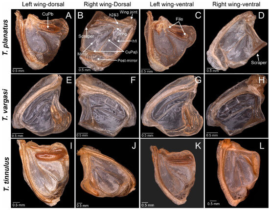 Tectucantus spp. wing morphology, dorsal and ventral view. (A–D) T. planatus (E–H) T. vargasi (I–L) T. tinnulus.