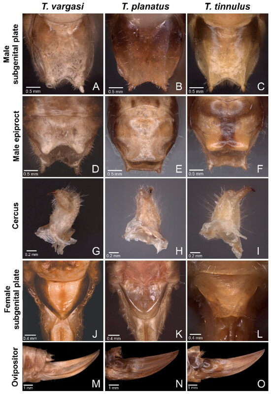 Tectucantus spp. abdominal morphological features. (A–C) Ventral view of male subgenital plate. (D–F) Dorsal view of male epiproct. (G–I) Male right cercus. (J–L) Dorsal view of female subgenital plate. (M–O) Side view of female ovipositor.