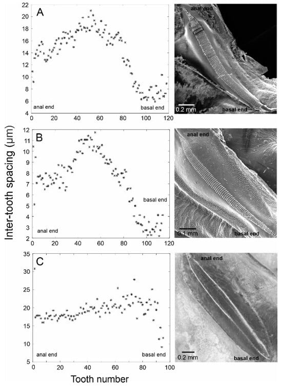 The stridulatory file of Tectucantus spp. Graph panels on the left show the measurements of inter-tooth distances in the direction of scraper motion during stridulation (anal to basal), and the panels on the right show SEM pictures of the files of each species, except for T. tinnulus. (A) T. planatus, (B) T. vargasi, and (C) T. tinnulus.