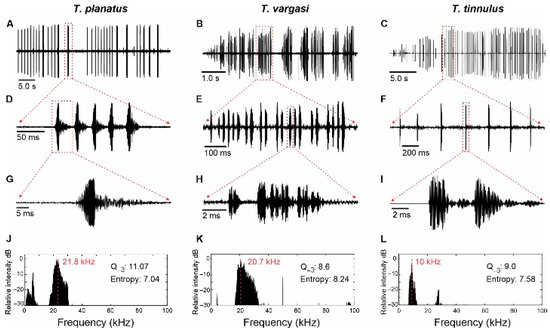 Acoustic analysis of Tectucantus spp. (A–C) Calling song of a recorded section. (D–F) Close-up view of an echeme. (G–I) Close-up view of a syllable (J–L) Frequency spectrum of a single syllable, red dashed line indicates peak frequency.