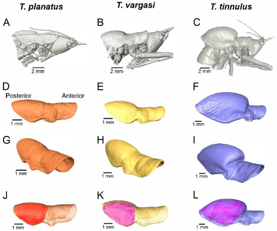 Three-dimensional segmentation and volumetric features. (A–C) Side view of head and thorax. (D–L) Pronotum 3D reconstruction, side view and pronotal cavity volume. (J–L) Pronotal volume represented by the shaded area.
