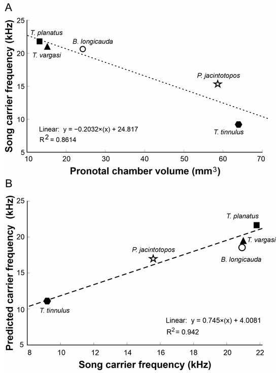 Relationships between Tectucantus spp. pronotal cavity and calling songs. (A) Correlation between pronotal volume and carrier frequency. (B) Correlation between carrier frequency and predicted carrier frequency.