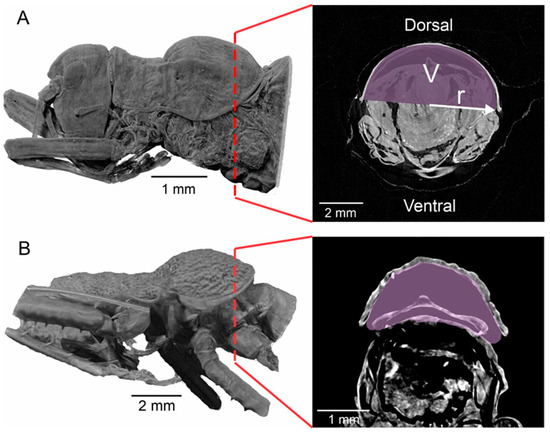 Three-dimensional segmentation and orthoslice features. (A) P. jacintotopos thorax side view and orthoslice. (B) B. longicauda thorax side view and orthoslice. V: volume, r: radius.