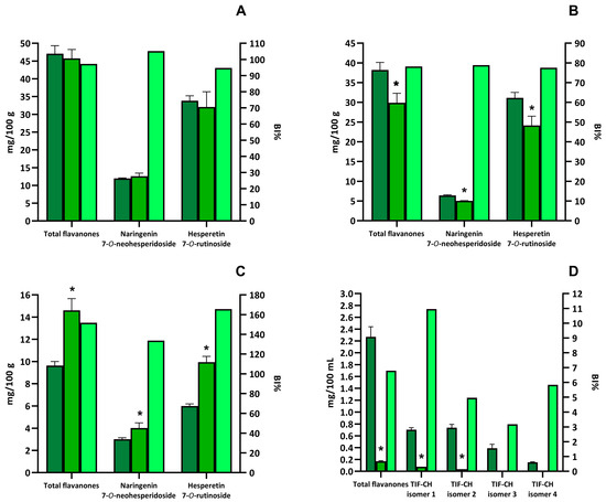 Quantification of total and individual flavanones in selected beverages and vegetable foods and bioaccessibility index (BI%). Dark green bars represent the amount of total or individual flavanones detected in the extracts. Green bars represent the amount of total or individual flavanones detected in the digested sample. Light green bars represent the bioaccessibility index for total or individual flavanones. The amount of total or individual flavanones is expressed as mg/100 g or mg/100 mL and reported in the left y-axis. The bioaccessibility index is expressed as the percentage of remaining compound after digestion, with respect to the amount in the extract, and is reported in the left x-axis. Selected foods were blonde orange (A), blood orange (B), orange juice (C), and rooibos tea (D). Asterisks indicate that the value is significantly (p < 0.05) different, with respect to the undigested sample. TIF-CH means tetra-hydroxyflavanone-C-hexoside.