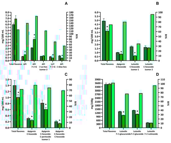Quantification of total and individual flavones in selected beverages and vegetable foods and bioaccessibility index (BI%). Dark green bars represent the amount of total or individual flavones detected in the extracts. Green bars represent the amount of total or individual flavones detected in the digested sample. Light green bars represent the bioaccessibility index for total or individual flavones. The amount of total or individual flavones is expressed as mg/100 g or mg/100 mL and is reported in the left y-axis. The bioaccessibility index is expressed as the percentage of remaining compound after digestion respect to the amount in the extract and is reported in the left x-axis. Selected foods were chamomile tea (A), rooibos tea (B), green tea (C), and red radicchio (D). Asterisks indicate that the value is significantly (p < 0.05) different, with respect to the undigested sample. API means apigenin whereas LUT means luteolin.