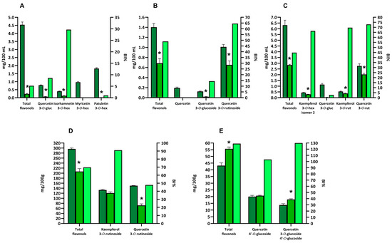 Quantification of total and individual flavonols in selected beverages and vegetable foods and bioaccessibility index (BI%). Dark green bars represent the amount of total or individual flavonols detected in the extracts. Green bars represent the amount of total or individual flavonols detected in the digested sample. Light green bars represent the bioaccessibility index for total or individual flavonols. The amount of total or individual flavonols is expressed as mg/100 g or mg/100 mL and is reported in the left y-axis. The bioaccessibility index is expressed as the percentage of the remaining compound after digestion, with respect to the amount in the extract, and is reported in the left x-axis. Selected foods were chamomile tea (A), rooibos tea (B), green tea (C), capers (D), and red-skinned onion (E). Asterisks indicate that the value is significantly (p < 0.05) different, with respect to the undigested sample.