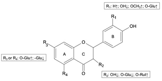 Structural characteristics of functional groups that affect the bioaccessibility of flavanones, flavones, and flavonols. ↑ indicates high bioaccessibility index; ↓ indicates low bioaccessibility index; Glu means a glucoside moiety; Rut means a rutinoside moiety.