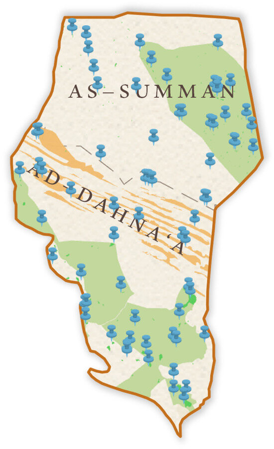 Due to its location, the KARR experiences a semi-arid to arid desert climate, characterized by hot days, cold nights, and minimal annual precipitation. The central and southern parts of the KARR, including Al-Tanahat, Al-Khafs, Noura, and the Ad-Dahna’a Desert, lie within the eastern geological section of Riyadh Province, known as Ar-Raf Alarabi (the Arabian Shelf). This area occupies the eastern part of the Najd Plateau, extending from Nufud Al-Sir in the west to the Ad Dahna region in northeastern Riyadh Province (Figure 2). The southern portion of the KARR represents approximately 5.9% of the Arabian Shelf, formed over ancient geological periods.