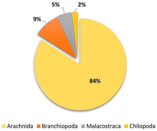 The biodiversity of similar organisms has been reported for other continents and countries. In the USA, animal biodiversity is estimated to include about 432 species of mammals, 800 species of birds, 311 species of reptiles, 295 species of amphibians, 1154 species of fishes, and more than 100,000 species of arthropods [35]. In Australia, 75% of the invertebrate group comprises insects (with more than 28,000 species of Coleoptera, 20,000 species of Lepidoptera, 14,000 species of Hymenoptera, 7700 species of Diptera, 5500 species of Hemiptera, and 2800 species of orthoptera). The arachnids include 79 species of spiders, 1000 species of mites and ticks, 150 species of pseudo-scorpions, and 120 species of scorpions [36]. In Europe, there are about 100,000 arthropod species, of which there are 500 chilopoda, 1500 diplopoda, 900 species of maxillopods, 400 species of ostracods, 1.500 species of isopods, 500 species of amphipods, 30 species of decapods, and 4100 species of spiders. Three scorpion species (Euscorpius, Belisarius, Lurus) are found only in the southern parts of Europe [37].