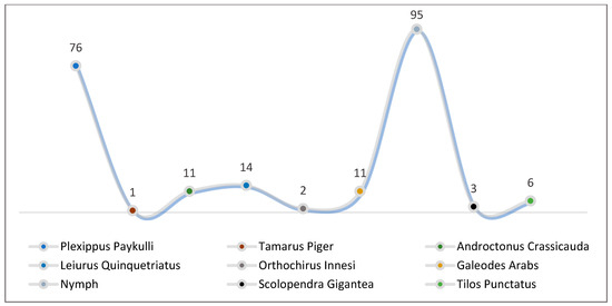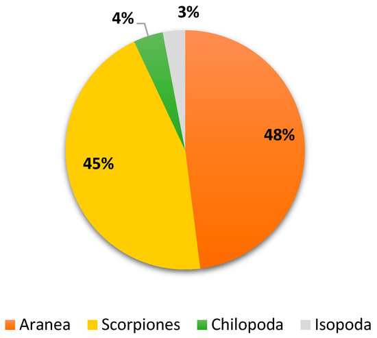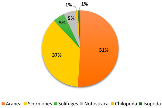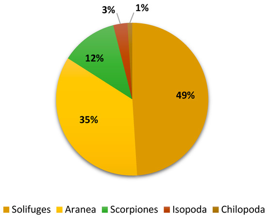 The most abundant spider orders collected during this period inlcuded Araneae (51%), Scorpions (37%), Solifugae (5%), Chilopoda (1%), Malacostraca (1%), and Branchiopoda (5%). There were five families and eleven species in these orders, including eight species of scorpions (Figure 6 and Table 3). Furthermore, Figure 7 shows the density of each of the identified species during August–September 2023.