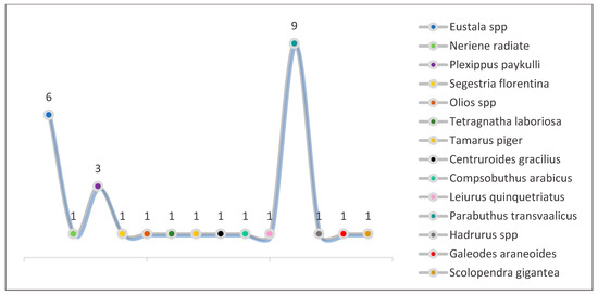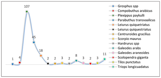 In Saudi Arabia, in addition to other spider species, about 26 species of scorpions were identified and distributed across 13 geographical regions [43].