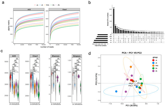 The rarefaction curves of the soil samples demonstrated a plateauing trend, indicating sufficient sequencing depth and a comprehensive reflection of species diversity within the samples. A total of 6961 operational taxonomic units (OTUs) were obtained from the cbbM microbial communities in the soil samples. Most of the OTU counts remained consistent across samples (Figure 1b), suggesting a high degree of similarity among coexisting species within these samples. No statistically significant differences in the alpha diversity indices of the cbbM communities were observed under different precipitation treatments (Figure 1c, p > 0.05). The richness indices (ACE, Chao1) of the cbbM communities followed the order Ja > Jb > Za > Wck > Zb, while the diversity indices (Shannon, Simpson indices) were ranked as Ja > Zb > Wck > Jb > Za. Principal component analysis (PCA) of the OTU composition, after noise and redundancy removal for dimensionality reduction, showed that the first and second principal components contributed 36.05% and 10.31% of the variance, respectively, with a cumulative contribution of 46.36% (Figure 1d). Overall, the cbbM community structures under different precipitation treatments were relatively similar, with the soil heterogeneity in Za and Ja being lower compared to the control (Wck). However, Jb exhibited the highest heterogeneity, indicating a more pronounced difference in the composition of carbon-sequestering microbial communities.