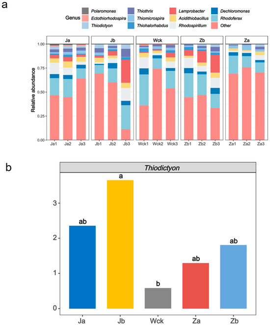 Microbial community composition; (a) community composition of cbbM carbon sequestration microorganisms; (b) genera-level difference in Thiodictyon. ab indicates significance, the same letter indicates no significant difference between groups (p > 0.05), and different letters indicate a significant difference between groups (p < 0.05).