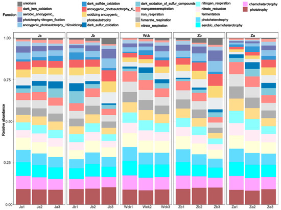 At the phylum level, Proteobacteria were the dominant bacterial group, and an analysis of the cbbM communities at the genus level (Figure 2a) showed that the relative abundance of unclassified taxa in the soil samples treated with Ja, Jb, Wck, Zb, and Za was 51.59%, 46.81%, 54.49%, 41.59%, and 71.59%, respectively. Among the identified genera, dominant taxa included Thiodictyon, Rhodoferax, Dechloromonas, Rhodospirillum, Acidithiobacillus, Lamprobacter, Thiohalorhabdus, Thiomicrospira, Thiothrix, Ectothiorhodospira, and Polaromonas. Rhodoferax was consistently observed as the genus with the highest relative abundance in the soil microbial communities across all precipitation treatments, with respective values of 15.65%, 16.09%, 20.43%, 20.29%, and 13.62%. The abundance of Thiodictyon varied among the different precipitation treatments. Variance analysis conducted on Thiodictyon (Figure 2b) demonstrated significant differences in community composition between the Jb and Wck treatments.