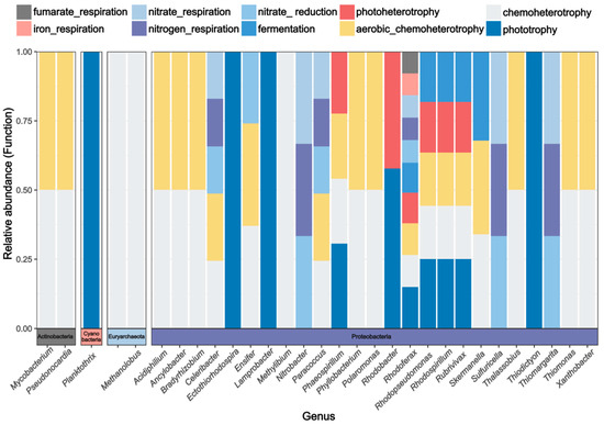 The FAPROTAX functional annotation results of the soil cbbM communities under different precipitation treatments (Figure 3) indicated that carbon-fixing microorganisms were categorized into 22 major ecological functional groups (relative abundance > 0.1%). The primary microbial functions associated with cbbM included phototrophy, chemoheterotrophy, aerobic_chemoheterotrophy, photoheterotrophy, fermentation, nitrate_reduction, nitrogen_respiration, nitrate_respiration, fumarate_respiration, and iron_respiration. An analysis of the major soil functional groups and their genus-level microbial communities (Figure 4) revealed that soil cbbM carbon-fixing microorganisms were distributed among 30 genus-level groups across four phyla, with 25 of these genera belonging to Proteobacteria, indicating that Proteobacteria dominated the carbon-fixing microbial community. Most bacteria exhibited predominant functional groups of chemoheterotrophy and aerobic chemoheterotrophy, suggesting that they gain energy for growth and reproduction through the oxidative decomposition of organic matter. Additionally, some anaerobic respiration functional groups, such as iron_respiration and nitrogen_respiration, were present, aiding the microbial community’s adaptation to hypoxic soil environments.
