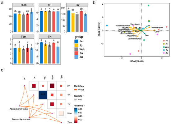 Soil physicochemical factors were significantly influenced by changes in precipitation (Figure 5a). The study found that the soil moisture content under the Za treatment was significantly higher than that of the other precipitation treatments, while the total carbon and total nitrogen values were lower. Treatments Zb and Ja increased the total carbon content in the soil. There were no significant differences in the soil pH, temperature, and total nitrogen content in response to precipitation changes. The α-diversity index and community structure of carbon-fixing microorganisms did not show a significant positive correlation with the soil physicochemical factors, although there was a relatively strong correlation between the total nitrogen and total carbon (Figure 5b). Redundancy analysis of the top 10 dominant microbial groups in terms of relative abundance and soil physicochemical factors (Figure 5c) concluded that different factors affected the microorganisms differently, with the pH and temperature being the main soil physicochemical factors influencing the community of carbon-fixing microorganisms.