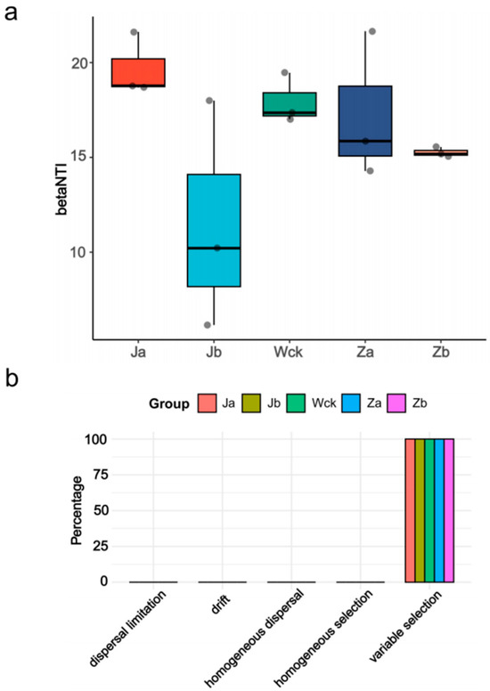 (a) betaNTI index of different groups; (b) distribution of community construction process in different groups.