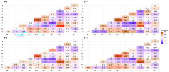 Pearson’s correlation coefficients among end-use quality traits using best linear unbiased estimates (BLUEs). GY, grain yield (kg ha−1); TW, test weight (kg m−3); GP, grain protein (%); GH, grain hardness; GD, grain diameter (mm); IGW, individual grain weight (mg); AFY, average flour yield (%); SE, softness equivalence (%); FP, flour protein (%); LA, lactic acid solvent retention capacity (%); SC, sodium carbonate solvent retention capacity (%). C16, Citra 2016; Q16, Quincy 2016; C17, Citra 2017; G18, Griffin 2018. *, **, and *** denote significance at 0.05, 0.01, and <0.01, respectively.