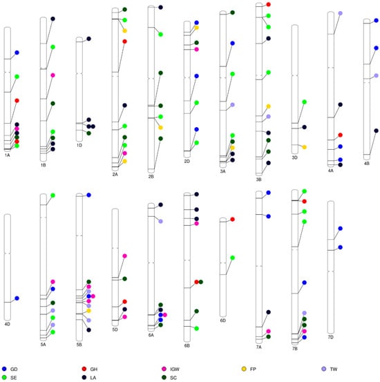 Distribution of significant marker–trait associations (MTAs) for wheat end-use quality traits. GD, grain diameter (mm); GH, grain hardness; IGW, individual grain weight (mg); FP, flour protein (%); TW, test weight (kg m−3); SE, softness equivalence (%); LA, lactic acid solvent retention capacity (%); SC, sodium carbonate solvent retention capacity (%).