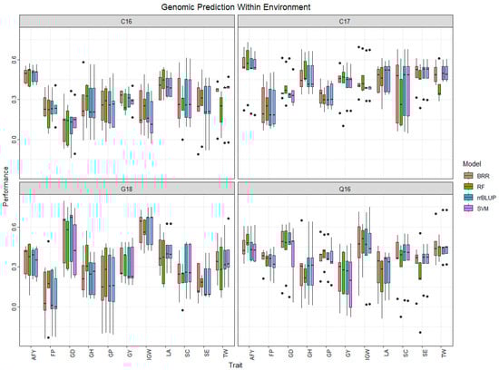 Within-environment prediction accuracy values were higher than across-environment prediction accuracy values for all traits. Within-environment cross-validation approaches involved training and validation populations from the same environment, accounting for environmental variation, whereas across-environment cross-validation approaches involved a training population from one environment and a validation population from another environment. This suggests that the importance of the effects of environment and genotype-by-environment interactions and prediction accuracy can be improved by including data on climate, weather, and soil types [4,69]. We also observed that highly heritable traits (GH, AFY, and IGW) have higher prediction accuracy than traits with low heritability (GY, GP, and FP). This confirms the role of the heritability of a trait in prediction accuracy values. The prediction accuracy result aligns with previous research where high heritability tends to lead to improved prediction accuracy [70,71]. We found differences in prediction accuracy generated by different models depending on the traits and environments evaluated in this study. This implies that prediction accuracy is higher when a specific model is used to train and predict similar heat-stress environments.