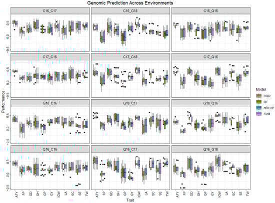 In across-environment cross-validation, four-fold data from one environment were used to predict the fifth-fold data from another environment, giving rise to 12 combinations of environments for each trait (Table S5, Figure 4). The lowest prediction accuracy was for GY-0.12 (SVM; Q16_C17) and the highest accuracy of 0.53 (RF: Q16_Q17) was observed for AFY. Negative prediction accuracies were obtained for GY and FP (Q16_G18), (C16_G18), (C17_Q16), (Q16_C17), and (G18_Q16). Overall, the highest prediction accuracy was found in C16_C17 (0.31 to 0.33), and the lowest one was found in G18_C16 and C17_G18 (0.08 to 0.16).