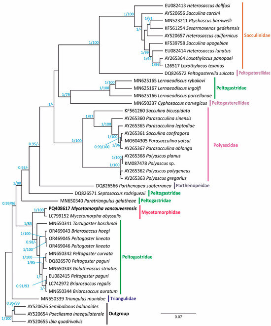 The newly generated sequence was used to resolve the phylogenetic position of the Mycetomorphidae. An alignment was built with 39 sequences of “kentrogonid” rhizocephalans and three species of Thoracica as the outgroup (Table 1). After trimming, the alignment was 1977 bp long, including gaps. Both BI and ML trees supported sister relationships between two species of Mycetomorpha (Figure 2). In the Bayesian tree, the mycetomorphids were resolved with high support as a sister group with various species of the Peltogastridae: Briarosaccus spp., Peltogaster spp., Galatheascus striatus, and Tortugaster boschmai. The ML analysis confirmed the common root of this group; however, the interrelationships within it were different: the Mycetomorphidae formed a common branch with Peltogaster lineatus and Briarosaccus hoegi, with moderate support. In both BI and ML analyses, the family Peltogastridae appeared polyphyletic. Paratriangulus galatheae and Septosaccus rodriguezii formed separate basal branches within a large clade comprising the Polyascidae, Sacculinidae, Parthenopeidae, and Peltogasterellidae. The representatives of the peltogastrid genus Lernaeodiscus grouped with Cyphosaccus norvegicus (Peltogasterellidae), and in the BI tree, this branch grouped with the Polyascidae and Sacculinidae. The Peltogasterellidae were also resolved as polyphyletic in our trees, as Peltogasterella sulcata grouped with the Sacculinidae with high support. Monophyly of the families Sacculinidae and Polyascidae was well supported.
